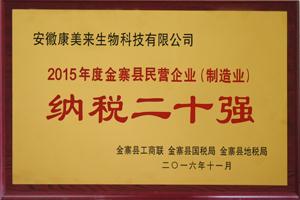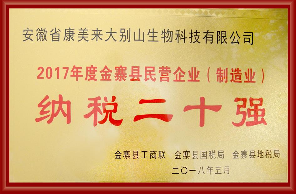榮獲:金寨縣工商聯(lián)、國(guó)稅局授予康美來(lái)“2017年度金寨縣民營(yíng)企業(yè)(制造業(yè))納稅二十強(qiáng)”稱(chēng)號(hào)