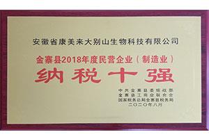 榮獲:金寨縣2018年度民營(yíng)企業(yè)(制造業(yè))“納稅十強(qiáng)”稱(chēng)號(hào)