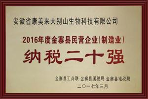 榮獲:2016年度金寨縣民營(yíng)企業(yè)(制造業(yè))納稅二十強(qiáng)