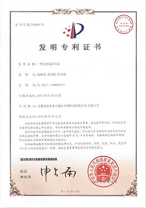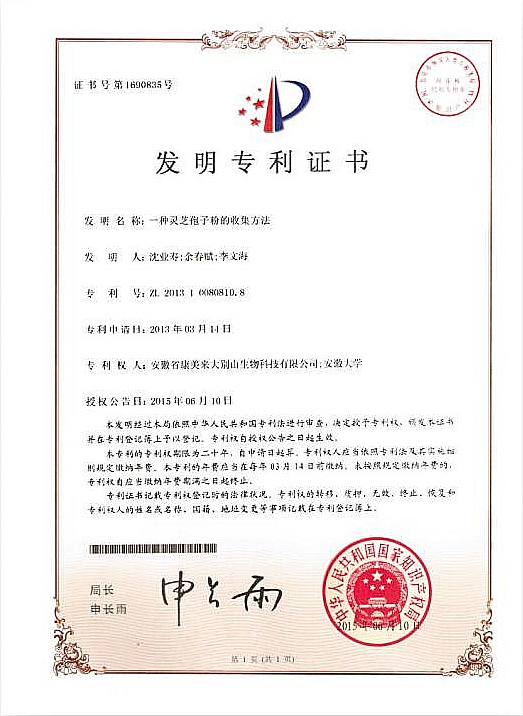 六、應(yīng)用國家發(fā)明專利技術(shù)。我公司通過自主科技創(chuàng)新,擁有兩項(xiàng)國家發(fā)明專利技術(shù):“一種靈芝栽培方法”,專利號:ZL201310080809.5 ;“一種靈芝孢子粉的收集方法”,專利號:ZL201310080810.8。