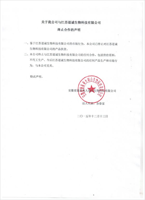NCB訊:近日,新華商網記者于12月14日在安徽省康美來大別山生物科技有限公司官網發現其刊登了兩則與江蘇道誠生物科技有限公司的聲明,第一條是終止與江蘇道誠生物科技有限公司的合作聲明,另一條則是以金寨縣活力源食用菌種植專業合作社的名義發布的與江蘇道誠生物科技有限公司無任何合作關系的聲明。新聞一前一后,可見安微省康美來大別山生物科技有限公司之前確與江蘇道誠生物公司有合作關系,只因江蘇道誠生物有限公司某些市場行為導致安微省康美來大別山生物科技有限公司決定停止對其的產品供貨以及不再代工生產。