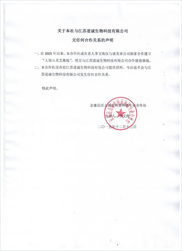 從第二則以金寨縣活力源食用菌種植專業合作社的名義發出的與江蘇道誠生物公司無任何合作關系聲明中,了解到自2005年以來,金寨縣活力源食用菌種植專業合作社負責人李文海僅僅是與康美來公司獨家合作建立“大別山靈芝基地”,并沒有與江蘇道誠生物科技有限公司合作建設任何基地。同時聲明從沒有給江蘇道誠生物公司提供過原料,今后也不會與江蘇道誠生物公司發生任何合作關系。