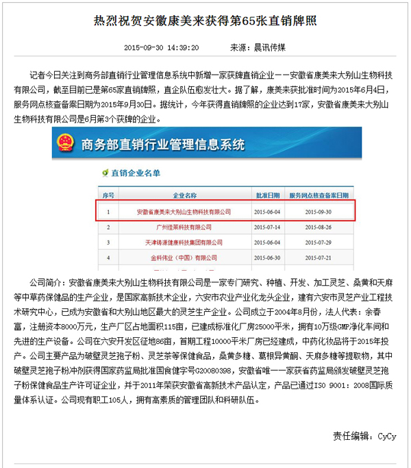 熱烈祝賀安徽康美來獲得第65張直銷牌照