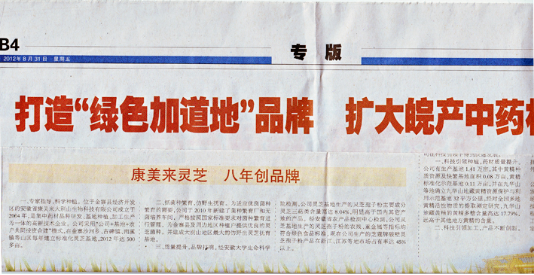 《安徽日?qǐng)?bào)》于2012年8月31日,專版介紹皖藥振興發(fā)展情況及成功品牌展示,專篇大題目為《打造“綠色加道地”品牌,擴(kuò)大皖產(chǎn)中藥材影響》,康美來(lái)公司作為省藥監(jiān)局推薦的六家著名皖藥品牌之一,在專刊上報(bào)道,題目為“康美來(lái)靈芝,八年創(chuàng)品牌”。