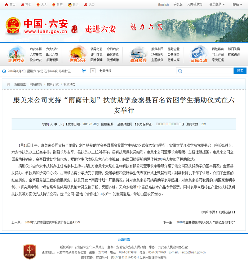 1月15日上午,康美來(lái)公司支持“雨露計(jì)劃”扶貧助學(xué)金寨縣百名貧困學(xué)生捐助儀式在
