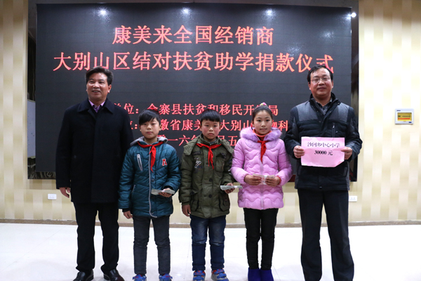 新年伊始,愛心接力。2016年1月5日下午,康美來公司處處歡聲笑語、暖意融融。縣扶貧和移民開發局領導,康美來公司董事長余春富先生和來自沙河鄉中心小學、燕子河鎮樹林小學、桃嶺鄉關山小學的師生們歡聚一堂,隆重舉行康美來公司支持政府“雨露計劃”結對捐資助學儀式。